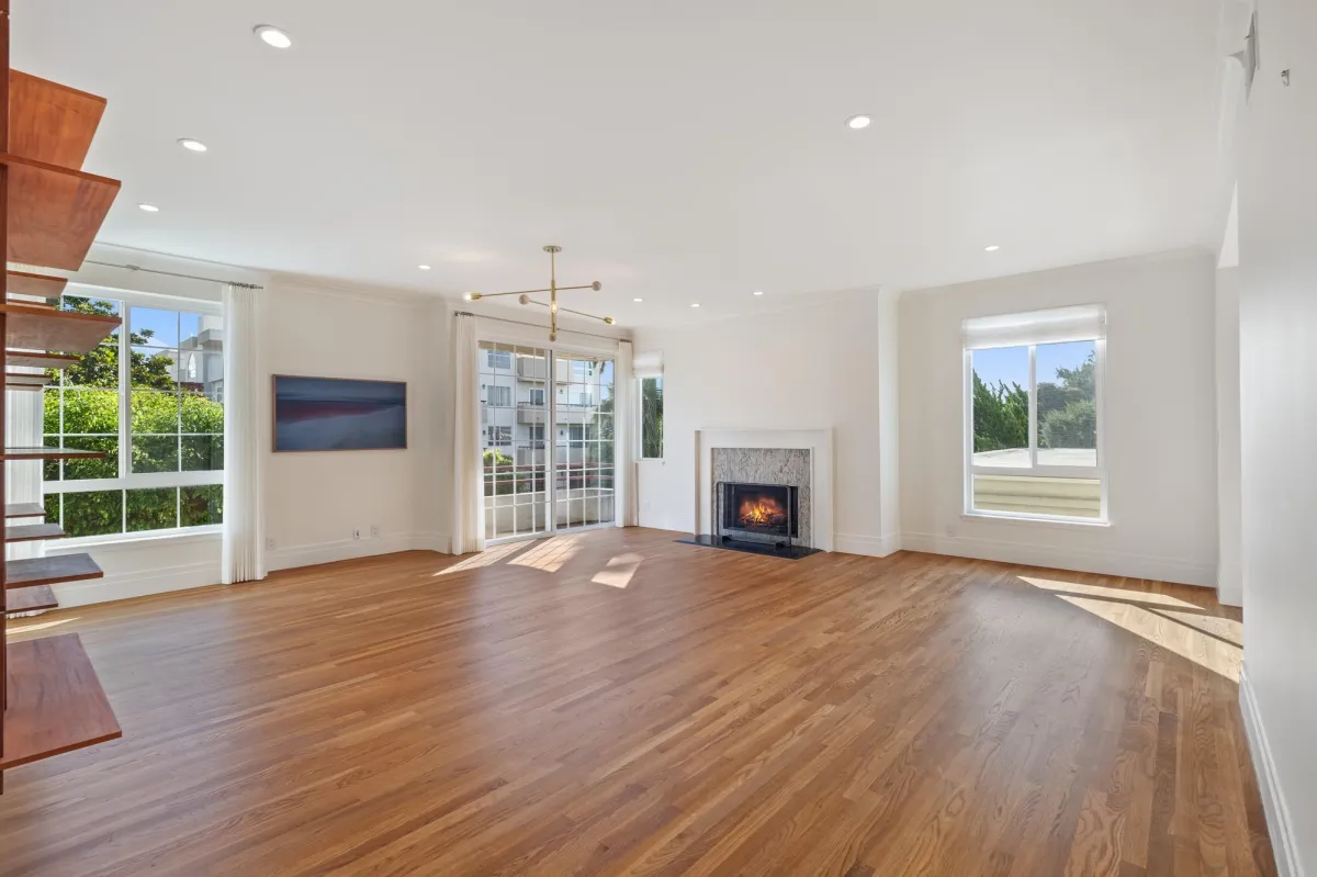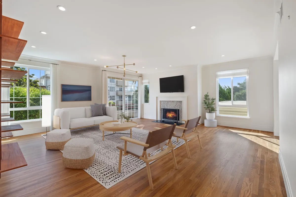 Experience ultimate privacy as the sole resident on the second floor. This unique architectural layout means no shared walls with neighbors on your level. The interior flow is defined by an open-concept floor plan, a cozy fireplace, and expansive windows that invite an abundance of natural light into every room.